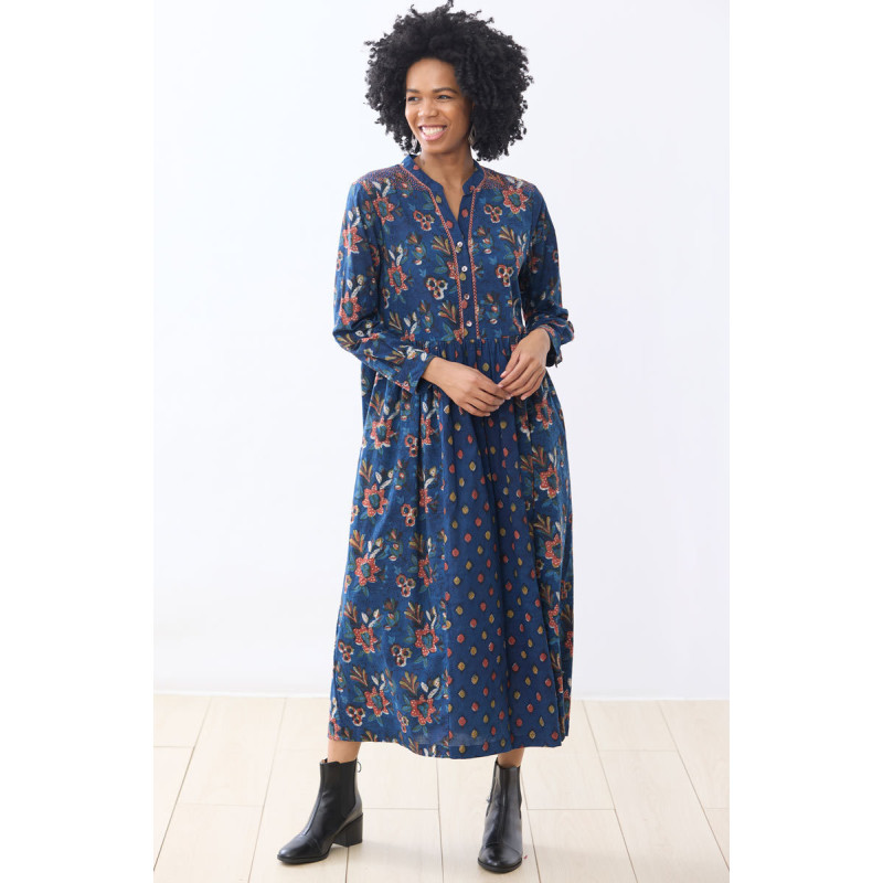 Soft, lightweight cotton dress in natural dyes of true indigo with autumn red and green blockprints. Button-placket and a gently-gathered skirt with a contrast center panel front and back. Hand embroidery accents the placket and shoulders. Long sleeves have button cuffs. Great for layering.