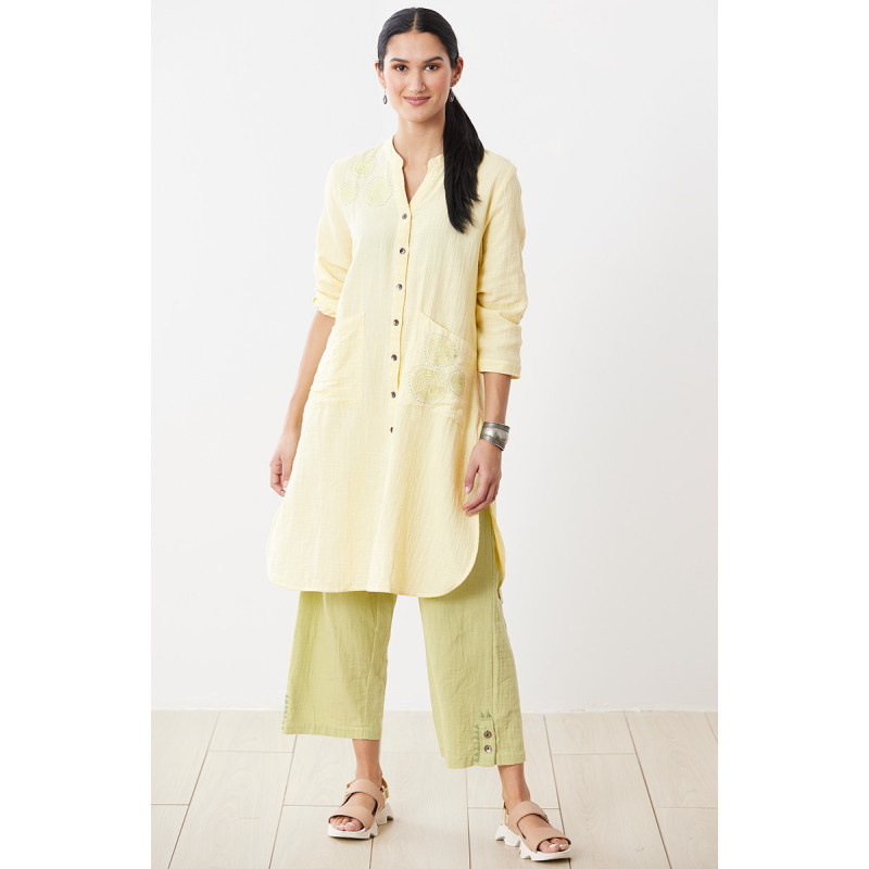 Button-front kurta styling in an effervescent pale green double gauze long shirt. Shirttail hem with deep side slits for an easy sweep. Three-quarter length sleeves. Hand embroidery accents.