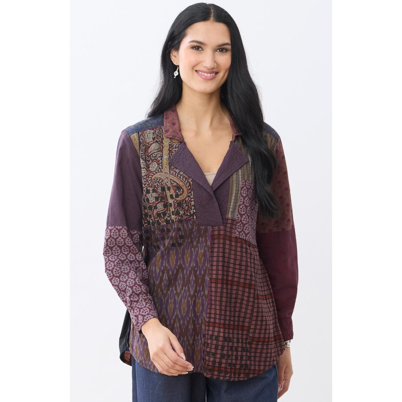 The ultimate upcycled popover top! Mixed overstock cotton fabrics combine in this patchwork shirt, and each piece is unique. The blazer-style collar and lapels let you adjust the neckline to your preference. Hand embroidery highlights the innovative seam detail. Shirttail hem, long sleeves with button cuffs ready to roll up. Deadstock (overstock) patchwork colors and patterns may vary due to the variety of upcycled fabrics.