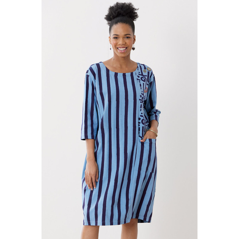 Easy scoop neck knit shift dress with block print stripes has a contrast panel with hand embroidery. Three-quarter length sleeves. Ready to go when you are!