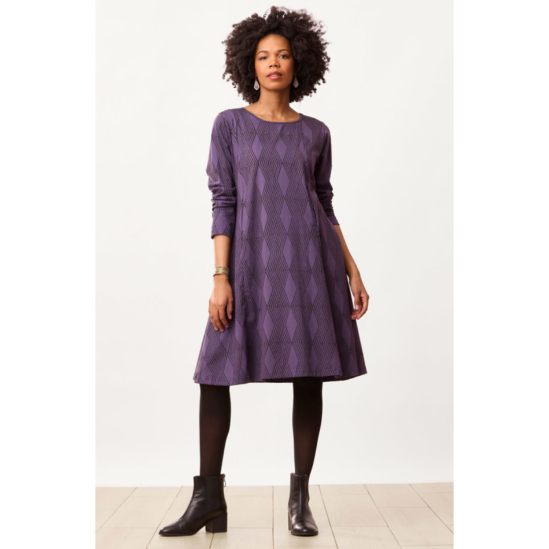 Our organic cotton jersey A-line dress with the asymmetrical front seams is blockprinted with organic ink. The eco-friendly deep purple dress can be worn two ways: the extra-long slash pockets on the front seams are great as pockets — or they pull out to become optional front ties! Hand embroidery accents the bodice.